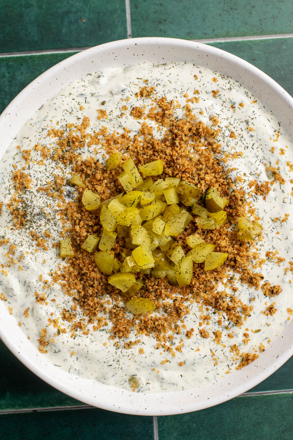- Top with the toasted breadcrumbs and more diced pickles. Enjoy dipped with tortilla chips, ruffle chips, or veggies!